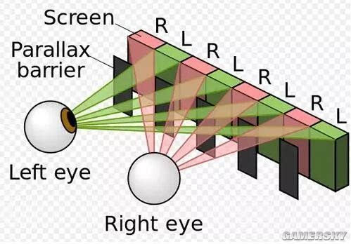 另一项就是大家津津乐道的任天堂3DS采用的特殊屏幕。大家都有看3D电影的经验,每个人佩戴一副3D眼镜,电影院提供的是偏振式,家用的往往是红绿或者红蓝眼镜,其实原理上都是让左右眼视觉信号隔绝,分别看到不同的、有一定视差的影像,从而产生立体效果。