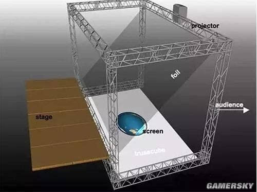 地面上有一个屏幕,然后钢架上架设一个45°倾斜的半透半反膜,其实根据初中物理学到的光学知识,大家就会明白,把半透半反膜当做一个镜子,那么地面屏幕上显示的东西恰好会被反射到观众的眼睛里,看起来就像是立着的。在环境光很暗的情况下,效果还是很惊艳的。